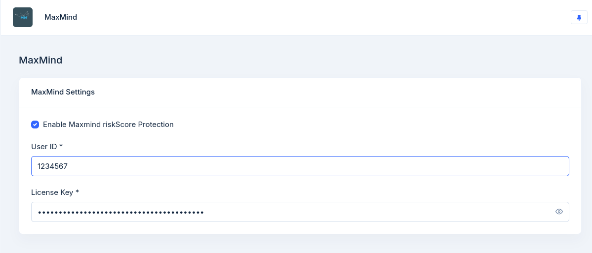 After installing maxmind, add your API User ID, License Key, and enable Maxmind riskScore Protection to start screening transcations with Maxmind.